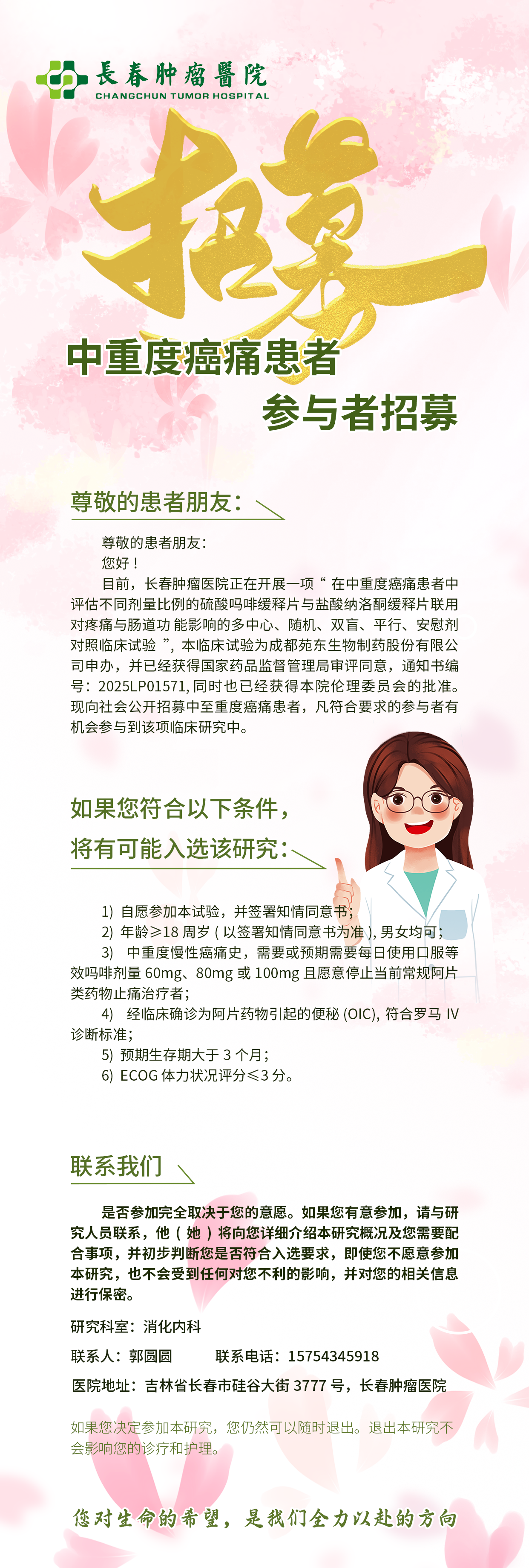 现在,长春肿瘤医院正在开展一项"在中重度癌痛患者中评估不同剂量比例的硫酸吗啡缓释片与盐酸纳洛酮缓释片联用对疼痛与肠道功能影响的多中心、随机、双盲、平行、安慰剂对照临床试验",为中重度癌痛患者带来新的希望。